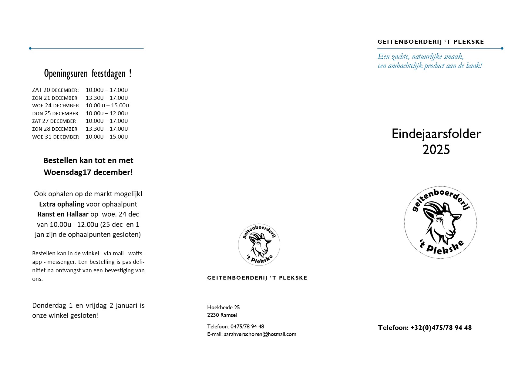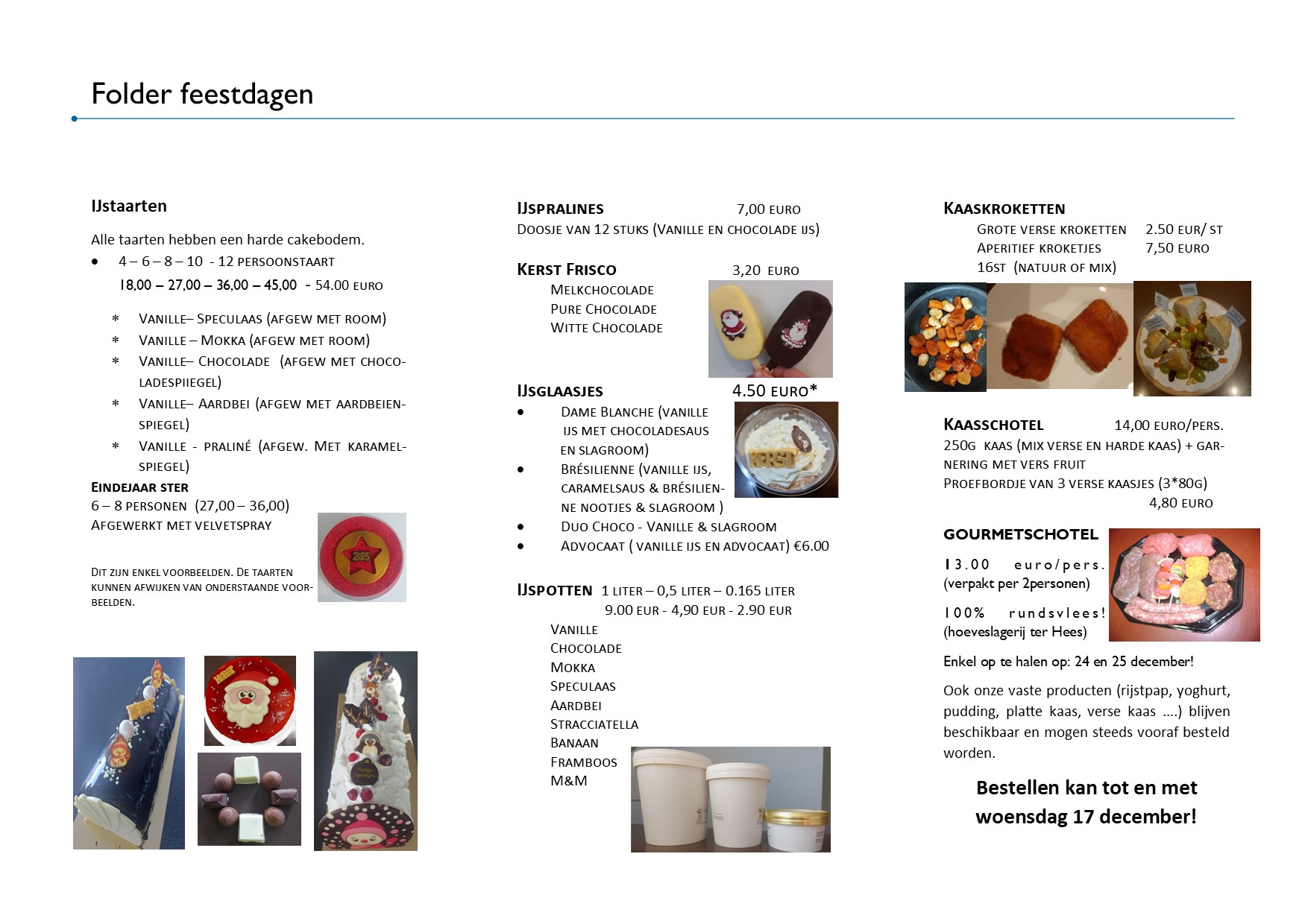Hieronder vindt u onze Folder voor de feestdagen. Bestellen kan tot en met woensdag 17 december via mail, sms, watts-app, messenger. De bestelling is pas definitief na ontvangst van bevestiging.